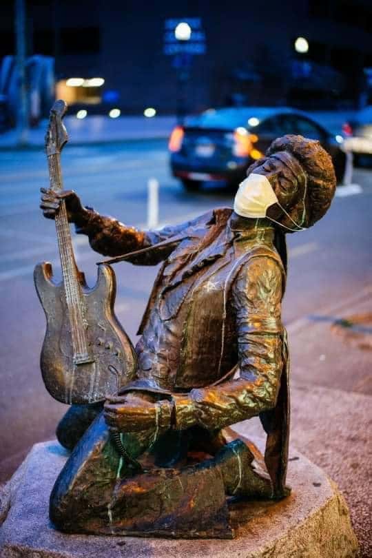 There are statues and tributes to him all over town (like here) . . . and this one’ appears to be ready for social distancing.